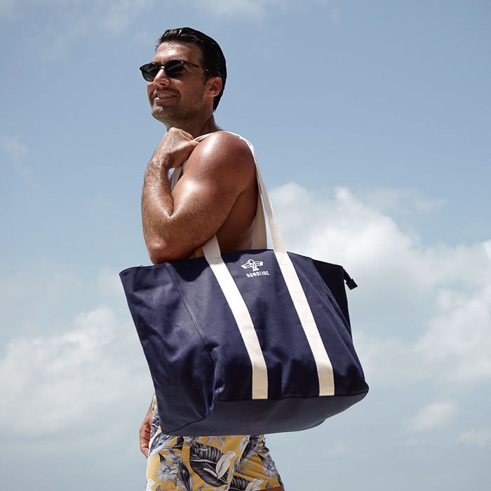 Introducing our versatile Navy Blue Canvas Beach Bag, designed for both style and durability. Crafted from sturdy, high-quality canvas, this bag is built to handle all your beach or poolside essentials with ease. The navy blue exterior gives it a sleek, timeless look, while the oversized white straps add a bold yet simple contrast, making it perfect for both men and women, or for family outings.