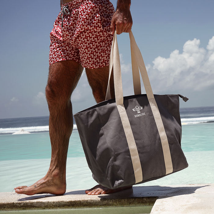 Our bag comfortably fits 4x large beach towels, sunscreen, water bottles and more!